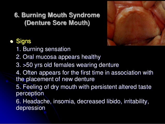 Burning mouth syndrome dentures. It is not a syndrome at all. In most cases patients suffering from burning mouth syndrome frequently continue their looking for proper treatment through a long series of oral and medical attendance to solve their problems and relieve the pain. The doctor dentist and periodontist cant find anything wrong and no-one has heard of burning mouth syndrome.
