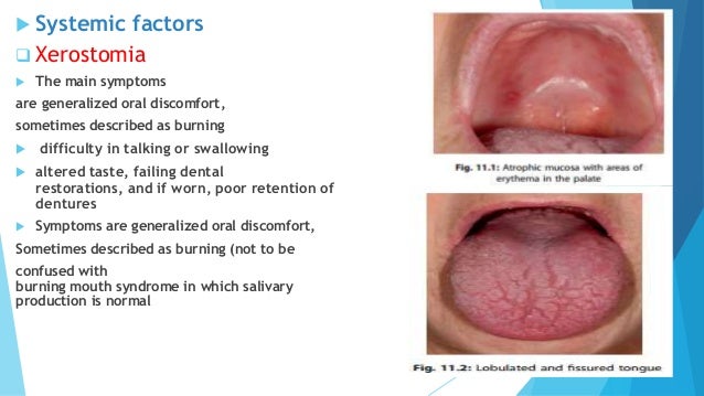 Alcohol-free dental products with low additives and minimal flavoring are recommended as are sugar-free candies and gum and non-caffeinated beverages. Burning mouth syndrome is intraoral pain usually involving the tongue in the absence of intraoral physical signs. Some of these patients are also allergic to metal and other laboratory denture materials.