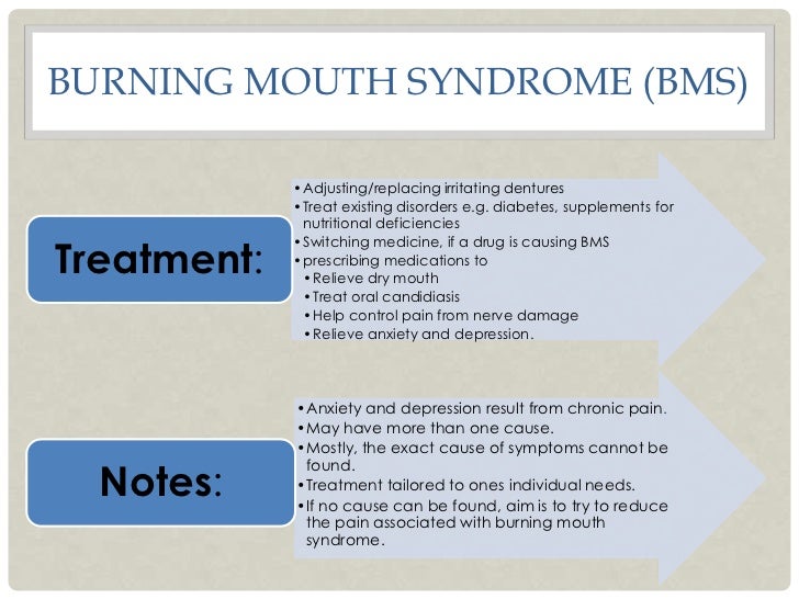 There are no specific diagnostic tests and treatment is symptomatic. A review and update Burning mouth syndrome BMS is mainly found in middle aged or elderly women and is characterized by intense burning or itching sensation of the tongue or other regions of the oral mucosa. To food or dental material CMCP 8.