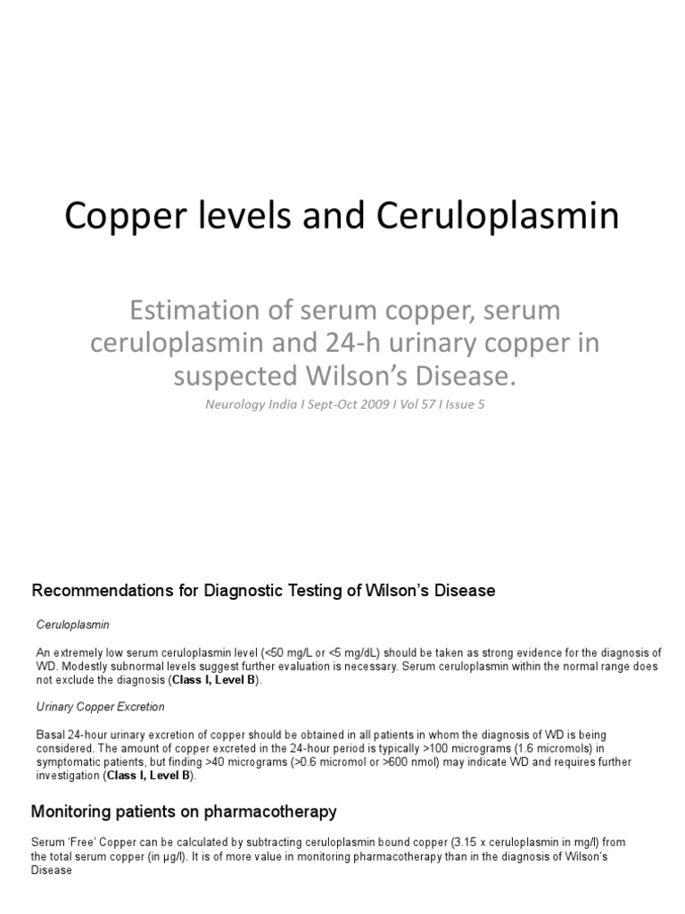 Ceruloplasmin the primary copper-carrying protein in the blood is also reduced in Wilson disease. Urine copper levels should be in the range expected for treatment with trientine alone in other words 1-2 mg 24 hours initially and then reducing to 05-10 mg after several months of treatment. Normal hepatic copper content is 50µgg dry weight.