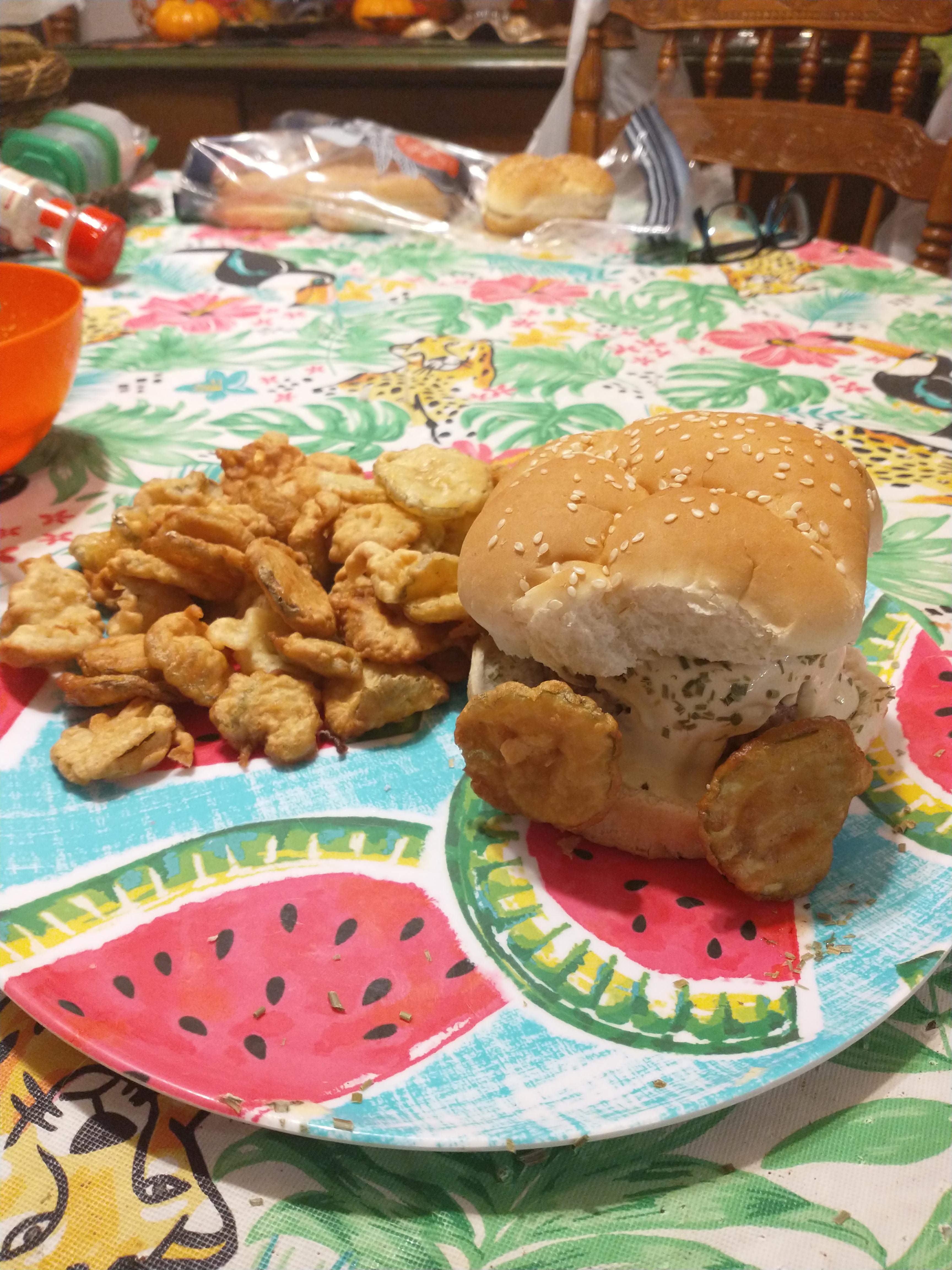 Cut your pickle up into even slices. Cook the burger for 4 or 5 minutes per side and then stick a food thermometer in from the edge all the way to the centre and cook until just under 160F or 71C. Chicken sandwich I ordered from a Dairy Queen in a small town.