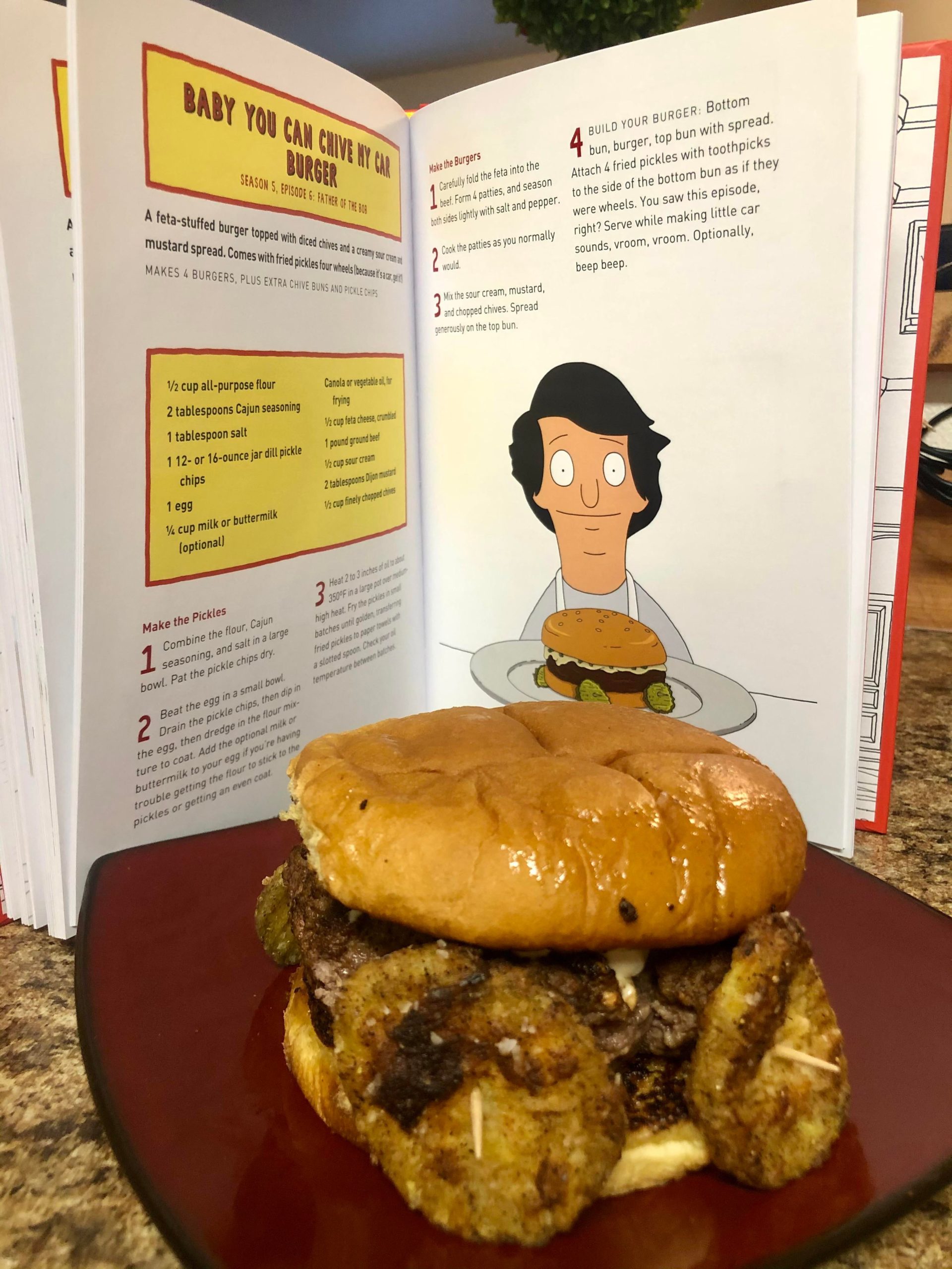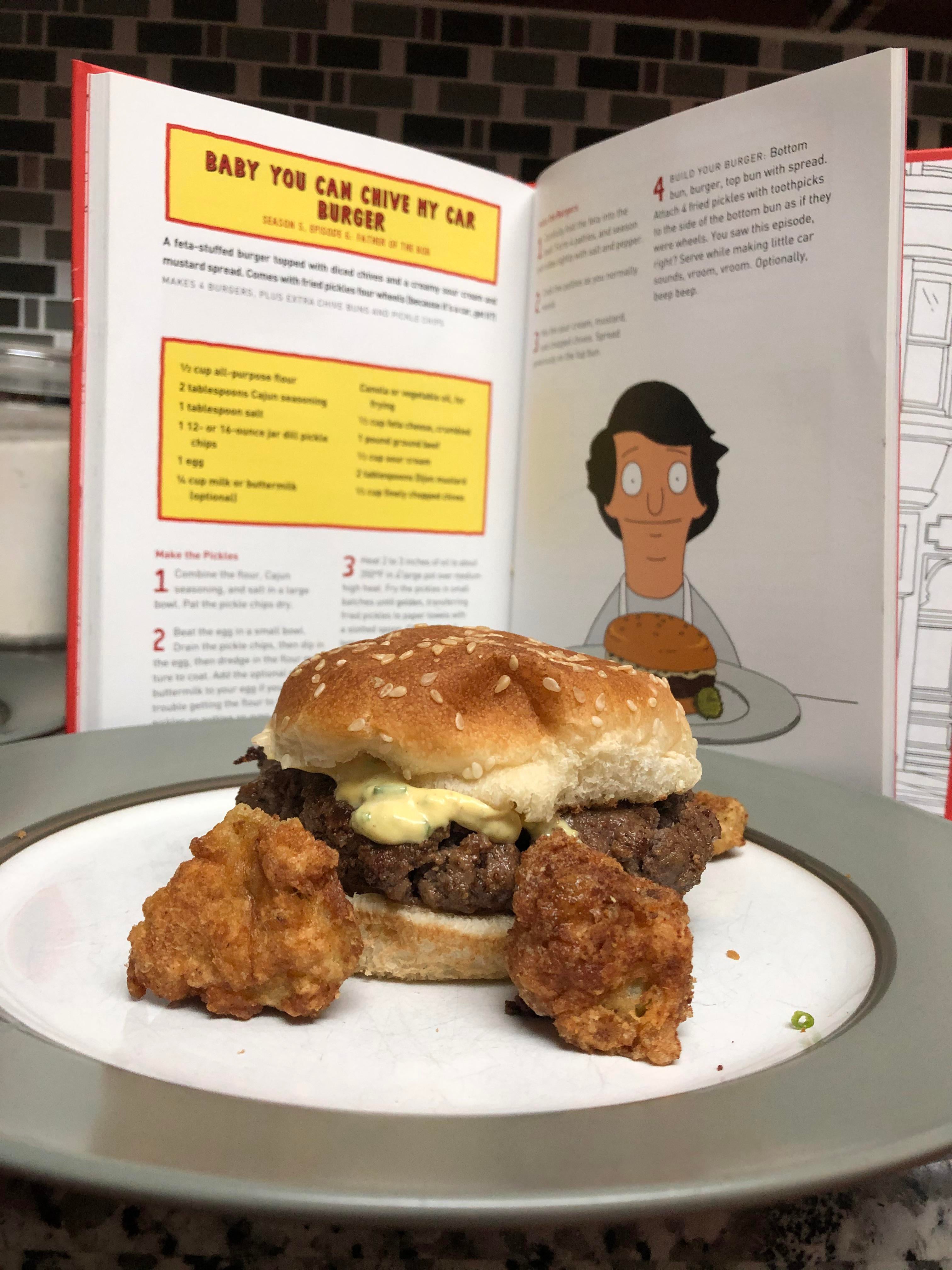 We bought the Bobs Burgers Burger Book that features the real recipes that are featured on the chalkboard of the restaurant. This episode features Bobs first-ever burger the Baby You Can Chive My Car Burger. Its simply a burger with sour cream chives and small fried pickle wheels on the sides that make that look favor a car. Watch Bobs Burgers anytime on Hulu or FOXNOW. Subscribe to us for weekly Bobs Burgers. I used only sour cream and dijon mustard. Homemade Baby Can You Chive My Car burger.