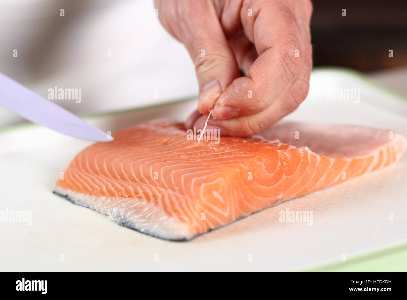 In comparison to salmon fillets salmon steaks include the bones and meat found inside them. The easiest way to remove these bones is to make a series of sweeping motions in one direction with the knife angling up against the rib bones while applying slight pressure with the free hand.